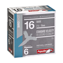 Aguila's hunting high-velocity shotshells have higher velocities than standard velocity shotshells and can carry the shot farther and with more energy.It uses strict performance standards, high-quality materials, and attention to detail that can be found under every crimp of every shell.Specifications:16 gauge/2.75"/1 oz/6 shot/25 per box/10 cs
