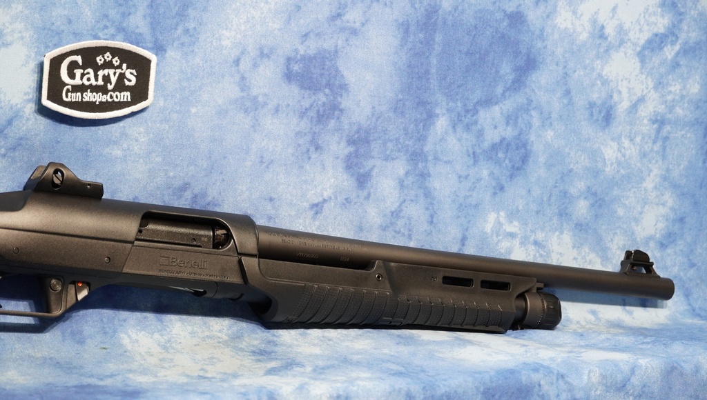- 18.5" matte blued barrel with fixed modified choke for optimum shot coverage in close-quarters engagements