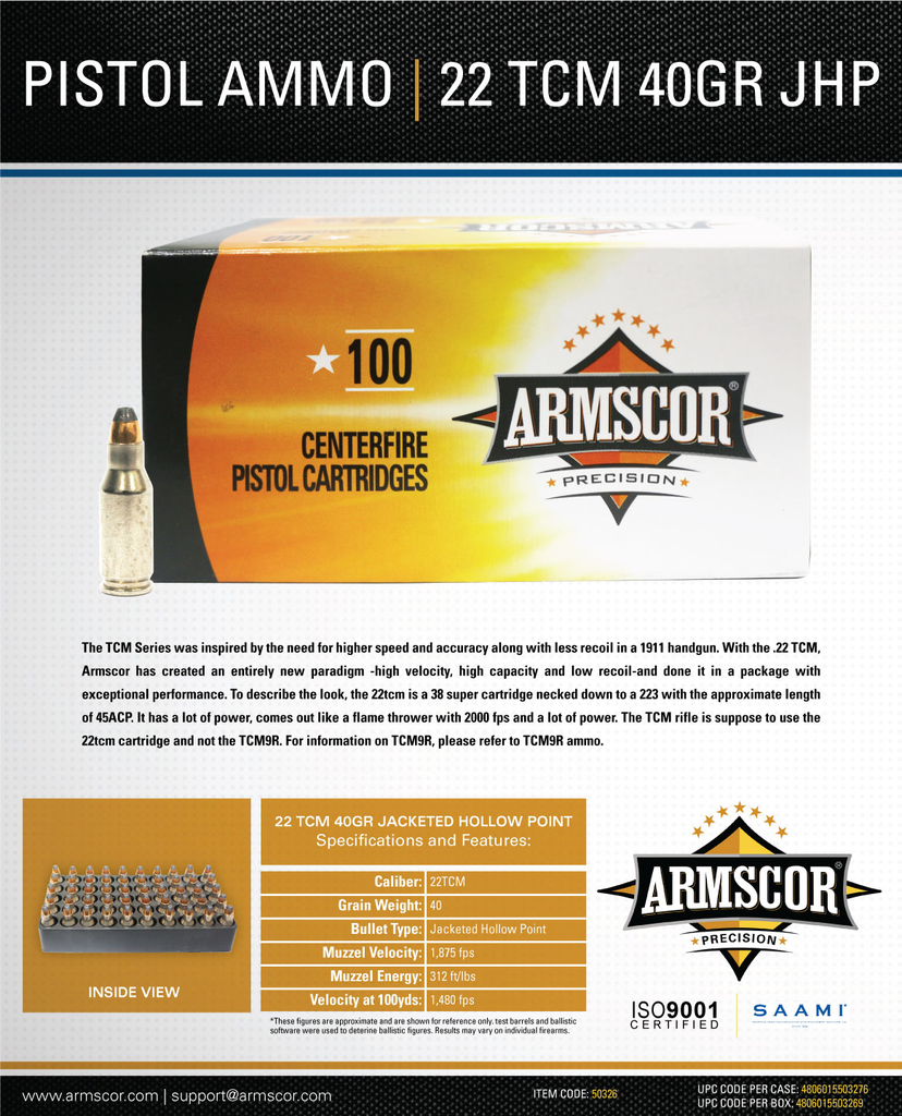 The TCM Series was created to offer improved speed and accuracy with reduced recoil in a 1911 handgun. Armscor Small Arms Ammunition provides a variety of competitively priced ammunition and components worldwide. As an ISO 9001 Certified Company, it meets SAAMI, CIP, and other standards. ARMSCOR products are trusted by police, military, and shooting enthusiasts for their quality and dependable performance.