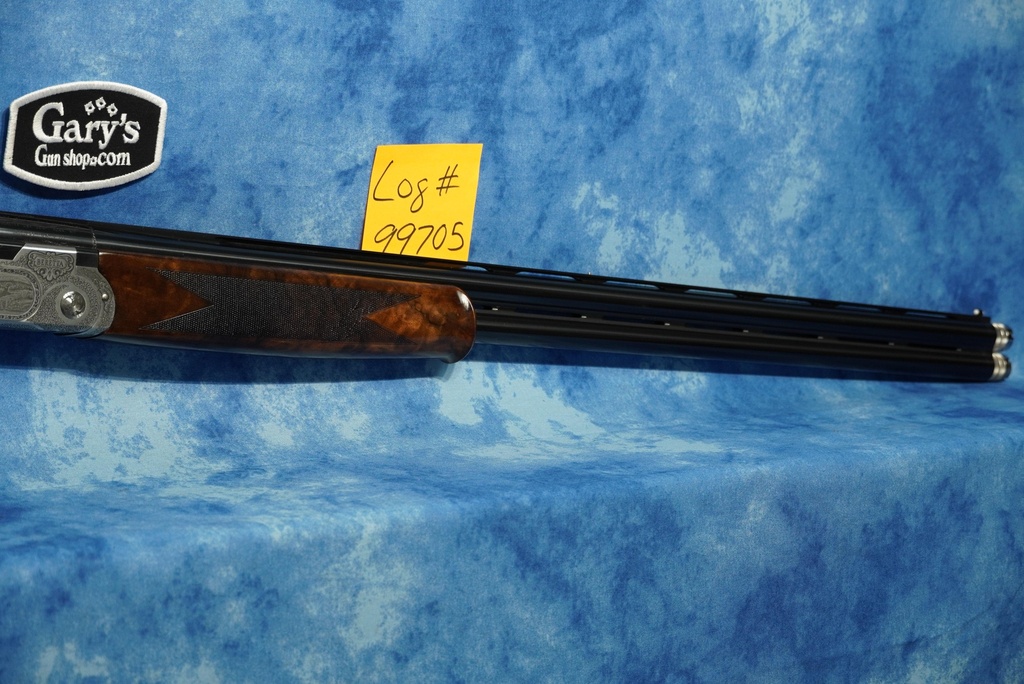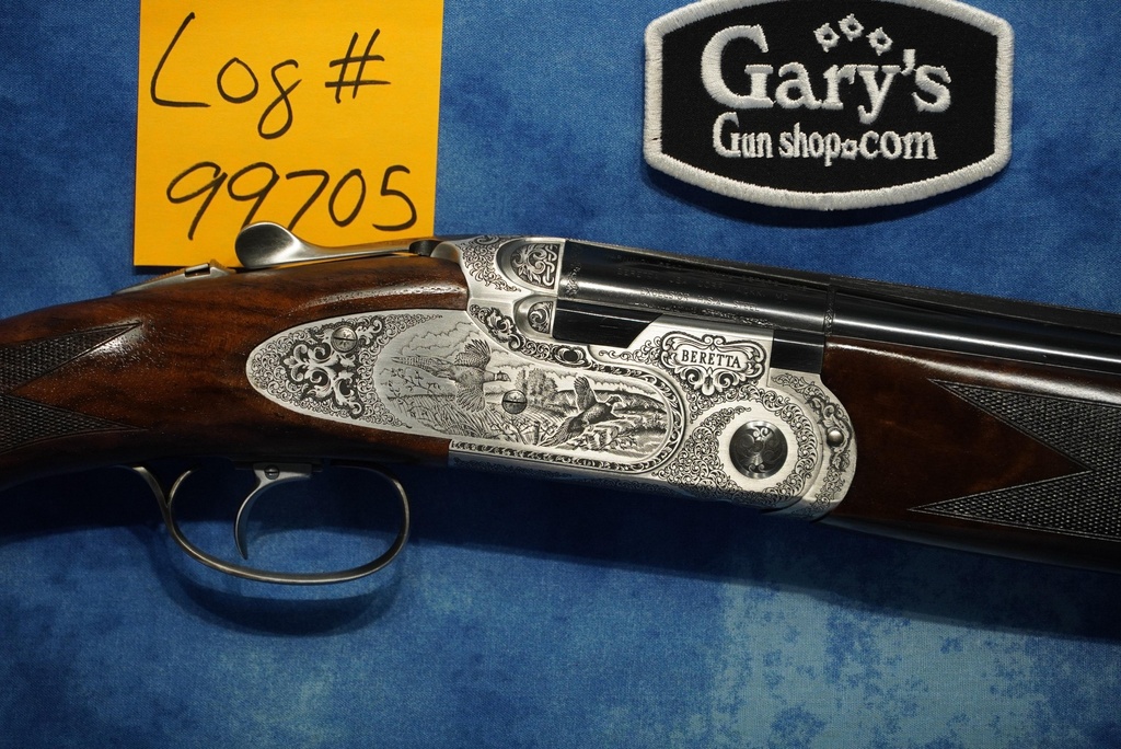 THE EXCEPTIONALLY STRONG and reliable Beretta low profile box lock action is enhanced with full side plates, hand-engraved with game scenes and signed by the engraver.